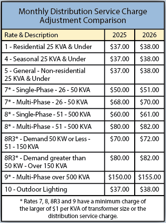 You support all these services through the rates you pay for electricity, but those rates must cover costs. Due to multiple years of inflationary pressure on material and labor costs, the cooperative will implement a rate adjustment to the distribution service charge effective on the bill you receive in February (due on March 10). All residential and single-phase services will see a $1 per month adjustment, all 3-phase services 500 kva or less will see a $2 per month adjustment and all 3-phase services over 500 kva will see a $5 per month adjustment. See the chart at right for a specific breakdown of the change.