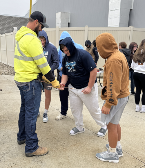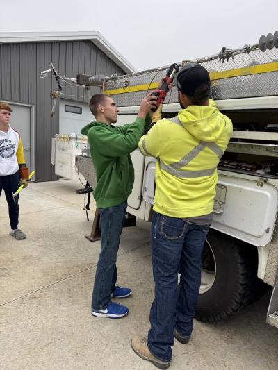 At the recent E3 Skilled Trades Day at Montpelier High School, students got to explore the career of a lineworker by performing some of the tasks that our employees do on the job. The students put on the linemen’s safety gear and reset a fuse, twisted a tie wire to an insulator, used a crimper to connect wires and also tried to cut another wire using only one hand.