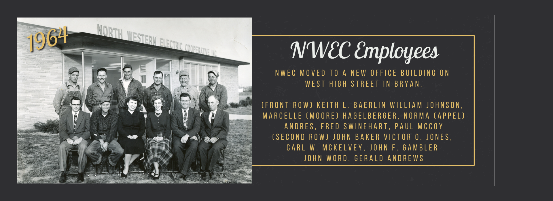 Local farmers in northwest Ohio decided they wanted the same benefits of central station electric service as people living in the city. Six men, Arthur Sherman, Paul McCoy, Burl Rigg, Paul Kimpel, Louis Balser, and Forrest Traxler took on the task of forming NWEC. The first NWEC office opened at 417 W. Main Street in Montpelier, OH